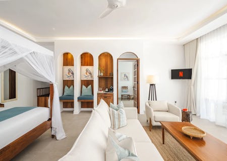 Kisiwa On The Beach has 22 stunning villas with large open plan bedrooms and private verandas. The villas are tastefully decorated with white stone and hand made wooden furniture, giving them a natural laid back feel. The tall wooden framed windows provide expansive views of the sea. All the villas have four poster wooden king sized beds elegantly draped with mosquito nets and open onto their own private balcony.There is an in-villa refreshments corner, satellite television and separate showers.