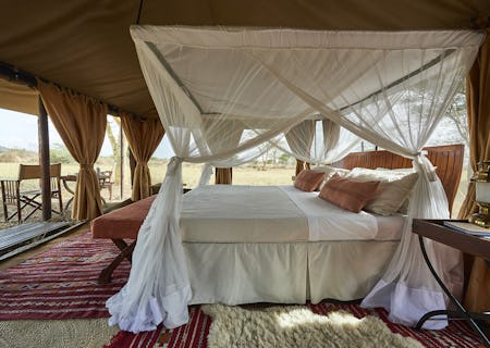 The camp's two sections – one accommodating up to 10 guests; the larger 14 – are spaced well apart for privacy. Each has its own central mess tent and lounge (the latter is arranged outdoors when the weather is good, making the most of views). The communal areas are simple shelters, although their interiors lack none of that old colonial charm – white table linen, comfortable sofas and African rugs. Soft lanterns enhance the sense of a romantic, old-school safari.