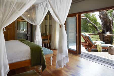 Nestled beneath the trees along the riverbank, the main lodge is perched on a stilted timber platform, high above the ground. Settle into one of many squashy sofas and listen to the river swishing past, or retire inside and sample an exquisite wine from the cellar. Rock-clad walls, smooth wooden floors and earthy colours give the lounge a wonderfully natural feel, and contemporary organic décor adds a modern touch. Just in front, the wide dining deck offers fantastic views over the river, and there’s a traditional African boma just below.