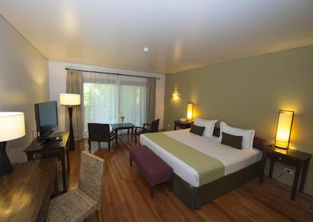 Soothing water features greet you as you enter the lobby, giving way to hardwood floors, exposed stone walls, charming antique furniture and colourful accessories in the main reception area. Weaving suspension bridges connect the buildings, adding to the jungle experience - it's an adventure just getting to your room! Food-wise, the open-plan poolside bar serves light meals and drinks throughout the day, whilst the main restaurant features international and local options buffet-style and a cool balcony seating. For the ideal end to a hectic day, head to Namasthe spa for some serious pampering.