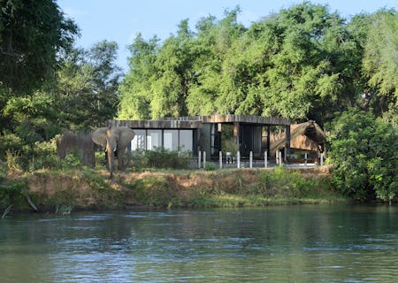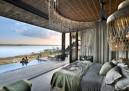 Practically floating on the Zambezi itself, Lolebezi enjoys one-kilometre of exclusive river frontage. The main lodge features thatched roofs, rustic wooden detailing and swathes of glass through which to enjoy the view. Inside, there is an all-day cafe and pizzeria, while the bar is suspended over a tranquil river inlet. The infinity pool blends seamlessly into the river - its on-the-water loungers are the best seat in the house - and the spa offers top-notch treatments to work out the day's kinks.