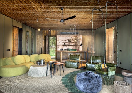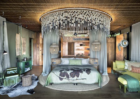 An intimate and exclusive lodge, there are just four suites and two family villas. Geometric and industrial in style, each room sits on stilts over the shallows and expansive windows mean the view is ever-present. The beds are large and ornate with a circle of hanging beaded decor overhead and river-green textiles. French doors open onto a private deck with a plunge pool and thatched sala inches from the water. The family villas feature two bedrooms, a sitting and dining area, and sunken veranda.