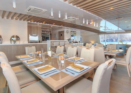 All 115 feet of the vessel is chic and streamline, beginning with the Sky Deck, where you'll doze on striped loungers and soak in the hexagonal Jacuzzi, to the bar with its comfy low-slung tables and al fresco barbecues. The lounge, which features slate-grey couches, eye-catching paintings and an expanse of windows, is where you'll have your daily briefings, and just next door is the dining room, serving a varied menu of local and international fare.