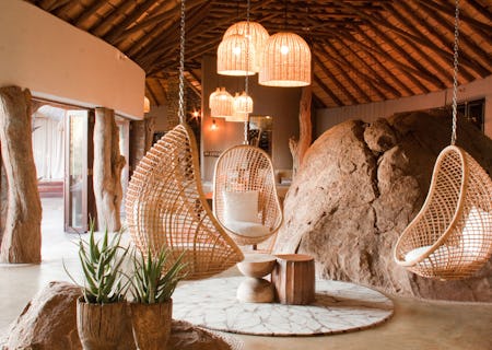 The lavish central guest area is an unusual design where traditional thatch and stone incorporates dramatic rock features and giant twisted leadwood trunks, literally bringing the bush inside. An elegant bar and silver service dining room opens out onto the huge raised viewing deck overlooking the waterhole. Nestled amongst the boulders is an outdoor boma, where delicious African bush cuisine is served under the stars. There's a small library, a well-equipped gym, and spa for use between game drives.