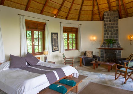 Fashioned from local lava stone, wood and thatch, the 12 eco-chic bungalows are big enough to house an entire gorilla family and come complete with outside terraces, mini-sitting areas and sizeable beds. Soft tones, sleek furniture and large glass windows keep things light and bright during the day and the log fire is a welcome addition in the evening. Ensuite bathrooms are just as spacious and you can choose between an enormous stone tub or vast shower to wash off the day’s dust.