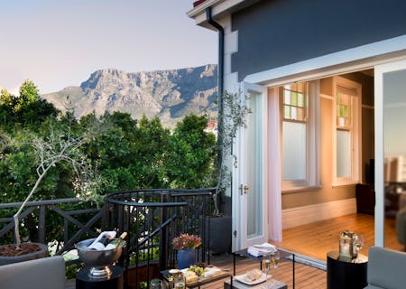 Staff will greet you at More Quarters and escort you to the villa, just next door. The house, with beautiful hardwood floors and high pressed-steel ceilings, is fit for Queen Victoria herself, although it's been updated with more modern touches. The large, fully equipped kitchen is separated from the dining room by a marble fireplace. The lounge opens to a pool, a shaded patio and a courtyard with gas BBQ. Upstairs a private balcony offers huge views of Table Mountain.
