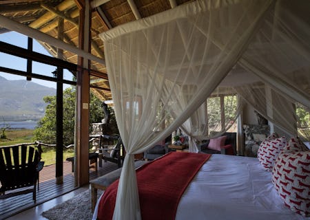 Boardwalks under a canopy of trees lead to the lapa where meals are shared outdoors or in front of a grand fireplace. Surrounded by stone and thatch with huge glass windows overlooking the spectacular lagoon, the lapa oozes a warm and rustic elegance. A heated plunge pool provides the perfect place to spot lagoon birdlife, and the deck is ideal for savouring a fine South African wine while the sky bursts into colours as the sun sets down the mountains.