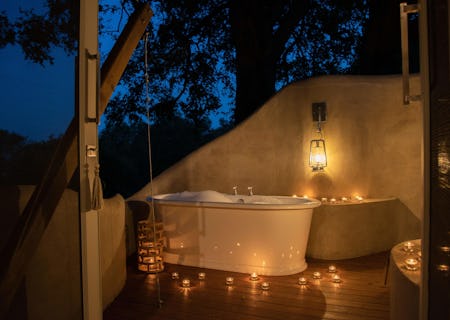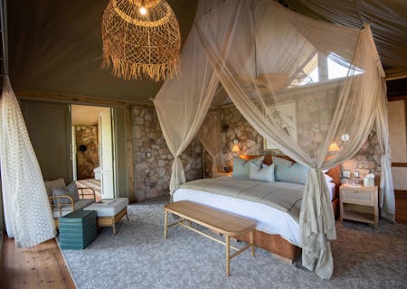 Four tents are strung along the river's edge within the cooling shade of the forest. All are elevated above the flowing water and framed by a wooden deck that's complete with a delectable plunge pool and perfectly-placed sun-loungers. Inside, creamy flowing canvas and canopied ceilings feel luxurious and warm whilst north-African influences add a touch of the exotic. King-size beds are positioned to look straight out of the vast (netted) windows, and you'll also find a small lounge area and a huge bathroom with bathtub and shower.