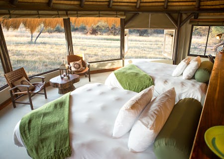There are eight double chalets and one honeymoon chalet at Okonjima Bush Camp. Each of the stone and thatched roof chalets has a wide canvas wall which can be rolled up to reveal a 180 degree panoramic views of the surrounding bush. There are ensuite showers, ceiling fans and AC, a lounge area, mini bar/ fridge and in-room telephones. They are decorated in rich African colours and natural materials have been used throughout.