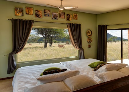 The main area is fondly referred to as the 'Barn'. With its high ceiling, exposed brickwork, polished concrete floors and floor-to-ceiling glass frontage, it has a very contemporary and open feel. There is a reception, bar, curio shop and restaurant with plenty of tables inside and outside, where it is split level and has lovely views over the waterhole and plains. Whilst it doesn't have the immediate intimacy of the smaller camps on the Okonjima reserve, there are little personal touches like framed family photographs. Out front, there is a large pool for washing off the safari dust.