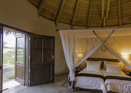 Recently refurbished and enlarged, Onguma Bush Camp is fresh and modern. It has 18 rooms, including three new rooms that, unlike the others, have no fences separating them from the waterhole. Each room has aircon, mosquito-netted beds, good lighting, a ceiling fan and a well-designed en-suite bathroom. The decor combines natural materials with crisp white linen and soft furnishings that echo the colours of the outdoors. Outside is a veranda, shared or private (check when booking), with great views.
