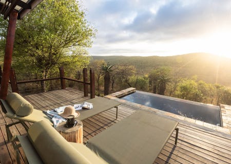 Rhino Ridge has four types of accommodation: two honeymoon bush villas with private plunge pools; eight luxury bush villas with huge open-plan bedrooms, a lounge area, fireplace, minibar, full bathroom and large viewing deck; four safari rooms with a private shower room leading on to a deck area; and two safari family suites ideal for families travelling with children. All rooms are carefully positioned to take advantage of those sensational views.