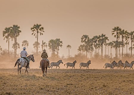 A typical day on the trail begins with a light breakfast and the morning on horseback, following game trails, spotting wild animals, and taking the odd canter through the shallow floodplains (which is magical). During rest time in between rides, guests can take a relaxed cruise on a mokoro, an ancient way of moving around the delta, where a man stands at the back of the dugout canoe and poles you through the shimmering waterways. Short walking trails are also offered, as you head out and learn about tracking and some of the little things in the wilderness.