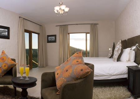 An imposing stone stairway leads up through the heavy wooden entrance doors into the vast main area and bar overlooking the swimming pool. The spacious dining room opens out onto a wide wraparound terrace with views over Windhoek to one side, and the reserve on the other. An inviting lounge with comfortable leather couches, open fireplace and desert-inspired décor offers a cosy winter retreat. Spa treatments are available in the wellness room, and there is a small curio shop.