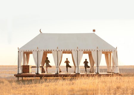 Everything here is exquisitely composed, like a film set. The luxury is only amplified by the lack - there is no electricity at San Camp, so paraffin lanterns scatter the camp and light the walks adding enchantment to the evenings. A mess tent with a large dining table is host to gourmet meals. You'll find a library tent full of bones and fascinating artefacts and carefully curated books. Take tea in the dedicated tea tent - a sprawling area with exotic rugs and cushions. Truly unwind in the tented yoga pavilion, meditating on the endless horizon.