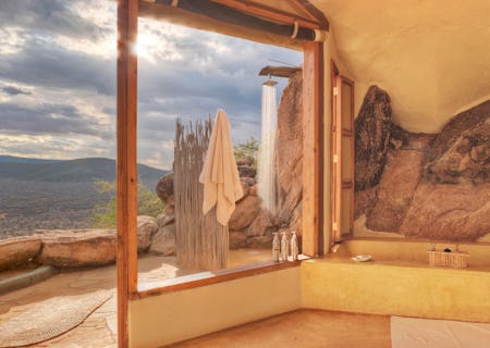 Saruni Samburu has six luxury, eco-chic villas. Each open-sided suite is spacious, with wooden floors, local fabrics, mosquito-netted beds and large bathrooms built to include the escarpment's boulders. Every space has a great view, and the veranda, with its comfortable chairs, is the perfect place to sit with your binoculars and a reference book to identify the game and bird species.
