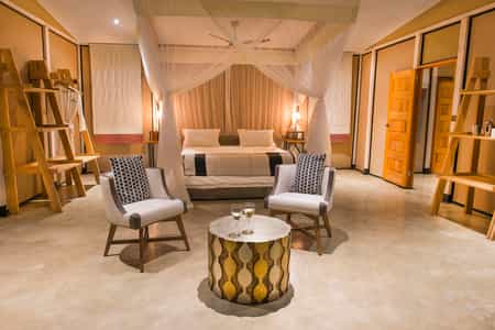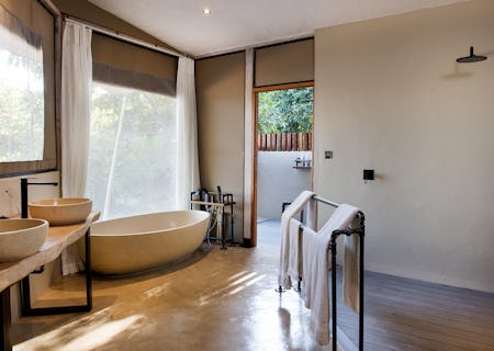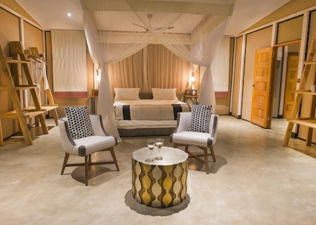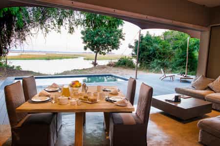 Found under a Bedouin styled tent with open back sides leading out to an enormous deck that overlooks and extends over the waters of the Zambezi river. Comfy chairs to lounge in or a swimming pool to swim laps alongside the passing crocodiles and hippos, the Zambian wildlife will surround you form every photogenic angle. A delightful dinner out in the bush adds an extra element of top-drawer delight to this camp.