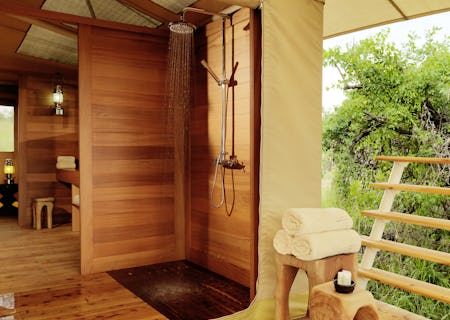 Bushtops has twelve incredibly stylish canvas suites on raised timber decks. The interiors are chic and uncluttered, with a classic safari palette of natural colours, solid timber furniture, and vast beds beneath romantic swathes of mosquito net. Ensuite bathrooms have super-soaking rain showers, and each tent has a private deck with a hot tub – there's nowhere better to relax and soak up the views in complete privacy. Two of the rooms are interlinked, and perfect for families.