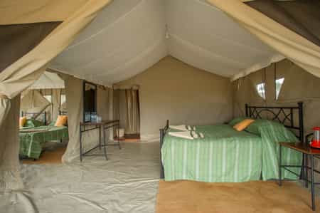 Kati Kati's 10 double tents and one family tent are arranged in a long row. Although they're not especially private, they're sufficiently roomy and have comfortable beds. At the rear of each tent is a bathroom with a chemical flush toilet and 20-litre bucket shower, which is filled by staff. There are no plug points (you can charge batteries in the main area) and lighting can be quite dim, though adequate. In front is a small covered veranda with chairs.