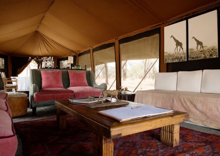 Set within a shady wooded area, the whole camp is centred around the lounge and dining tent, and fire pit and seating area. Simple but adequate, the main tent is furnished with comfortable chairs, colourful throw pillows and Moroccan rugs. Meals are served at wooden tables in the dining area, elegantly lain with white tablecloths, and scattered with lanterns by night. The fire pit opens out to the savanna; come here to re-tell and re-live the day's events over a nightcap or two.