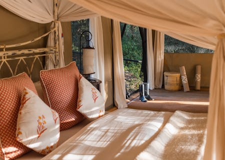 Perched on platforms for the ultimate in uninterrupted views, the six tents are as big as marquees and perfectly bush-chic in a totally understated way. Enormous double beds draped in mosquito nets take centre stage, surrounded by simple woven rugs and carved writing desks and there’s plenty of cushions and chairs on the veranda to relax in. En-suite bathrooms have twin sinks, showers and huge bath tubs to float in and and gaze at the divine views of the Mara River and Oloololo Escarpment.