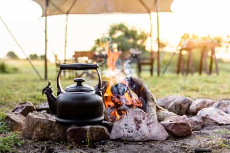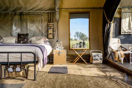 Six large single bedroom canvas tents become your 'glamping' home away from home for your stay. Each tent has ensuite facilities like hot showers, large outdoor covered tent terraces with reading area with private deck. Comfortable and inviting camp cots furnished with simple wools and leathers and rich smells of canvas and hessian carpets complete the laid back African safari style, the tent windows rolled up to reveal the full might of the surrounding Serengeti bush.