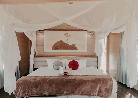 The 15 chalets are linked by raised wooden walkways, snaking across the lengths of the boulders. Styled with white-washed wooden sides and under a ceiling of bedouin canvas, each of the chalets is designed to provide maximum privacy and picture-perfect views from the private deck. Inside, the chalets feel fresh and bright with a touch of the contemporary - think spangly light fittings and art-deco rugs. Ensuite bathrooms are clean and fresh with fabulous marble and wood basins, and enormous sparkling mirrors.