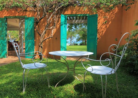 Sleeping 14 people in total, the house has just six bedrooms, each with a view of the sea or lagoon. Opening onto an airy corridors or the garden, the rooms come in various shades from magenta to bright orange including turquoise shutters. Most rooms have four-poster beds with trusty mosquito nets and a fans or two. The Moonamal room has a king-size bed, outdoor bathtub and lounge area while the Cinnamon Hill room has a two bedrooms (plus an extra small room for the kids) and a private balcony.