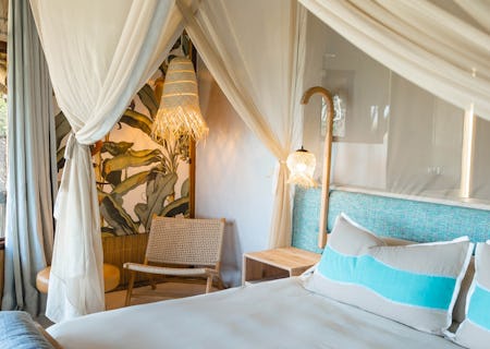 The lodge sleeps 24 in spacious suites of sun-bleached wood and glass hidden in the dune forest and raised on wooden stilts. Each is air conditioned, with a huge bed enclosed in a billowing mosquito net and an en-suite bathroom. Deluxe and family rooms have a massive bath and the Deluxe rooms also have an outdoor shower. Thoughtful extras included golf umbrellas and a small cooler box, as well as dressing gowns. Some rooms offer sea views; others are set within the dune forest. All have private balconies.