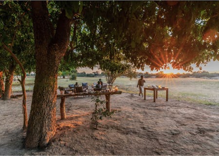 The only part of the camp not on stilts, the main chitenge at Nsolo is a shady refuge from the heat. Hand woven rugs line the wooden floors and safari artefacts of old are dotted around in a contemporary colonial style. Safari chairs, hidden in the shade of the evergreen trees around camp, provide excellent viewing points over the surrounding landscape. Meals are usually served in the cool chitenge or for special occasions, in the riverbed.