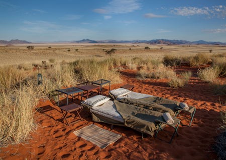Your "tents" have no walls or roof - just a sky for a ceiling and the desert sands as a floor. With a maximum of eight guests on each trail, you're guaranteed a bit of privacy behind a dune. You'll find a stretcher bed topped with a thick foam mattress, crisp sheets, a duvet and a fluffy pillow - all protected by a waterproof canvas. A hot water bottle is a particular comfort on cold winter nights. There's one communal "bathroom" at each trail camp, consisting of a bucket shower and a long drop toilet. Both are kept spotless and boast stunning views.