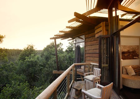 A well-lit wooden walkway leads from the main lodge to 10 luxury suites and six two-bedroom villas. All are secluded within the trees, with glass walls and private decks for those panoramic views (this is a truly beautiful part of the country) and infinity plunge pools, which may be visited by playful vervet monkeys. The bathrooms have deep stone tubs, twin sinks and al fresco showers. The two-bedroom villas have kitchenettes and dining rooms and other items vital for families and larger parties.