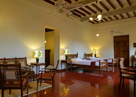With high ceilings and handmade Aathangudy tile floors, the spacious rooms at Visalam are decked out in traditional furnishings crafted from Burma teak. Chettinad Suites come with an ornate king-size bed, desk, vanity counter, lounge area and balcony overlooking the garden where you can enjoy a cuppa. Chettinad Rooms are quite similar but slightly smaller and some don't have a balcony. Each room also has an en-suite bathroom, tea/coffee facilities, air con and hand-woven bed linen. Soft lighting and honey-coloured floors give the rooms a warm feel.