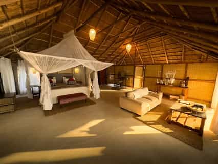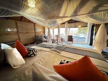 The main area at Vunda is a large double storey wooden structure that encompasses the bar, lounge and dining room upstairs, overlooking a wide section of the Zambezi. There are many comfortable chairs and couches, a small selection of books and a little tea and coffee table. Right on the bank of the river, under an impressive jackalberry tree, is the camp's communal fire pit, which, being open onto the bush, regularly receives visitors of the trunked four-legged kind. Behind the main area is a small pan that attracts wildlife throughout the day, with a thatched hide where you can sit and watch the action.