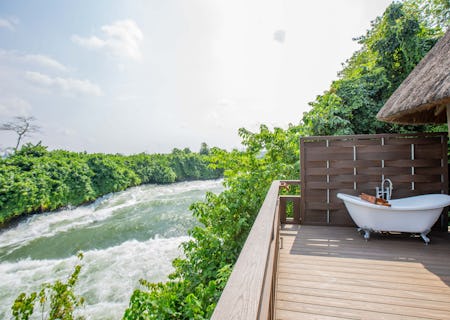 Each of the nine wood, canvas and stone rooms are set among the trees, with beautiful views across the forest and Kalagala Falls. In each, you'll find a large bed draped in white linen and a queen-size day bed for ultimate river-gazing. The en-suite bathrooms have powerful rain showers and plenty of hot water, and outside, there's a private balcony overlooking the Nile. Enjoy evenings sitting in the armchairs with your favourite book, or soak in the outdoor tub and count the stars.